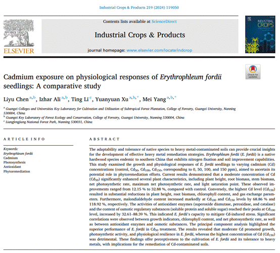 近日,best365官网杨梅教授科研团队在探究本地树种格木对重金属镉污染土壤的适应性和耐受性上取得重要见解,研究成果以“Cadmium exposure on physiological responses ofErythrophleum fordiiseedlings: A comparative study”为题发表于农林领域国际知名期刊INDUSTRIAL CROPS AND PRODUCTS(农林类期刊排名8/125)。英国best365官方网站入口在读硕士研究生陈丽宇作为第一作者,杨梅教授和徐圆圆讲师作为通讯作者,博士后Izhar Ali、良凤江国家森林公园李婷参与了本论文的工作。本研究得到了国家自然科学基金(32371856)等项目的支持。